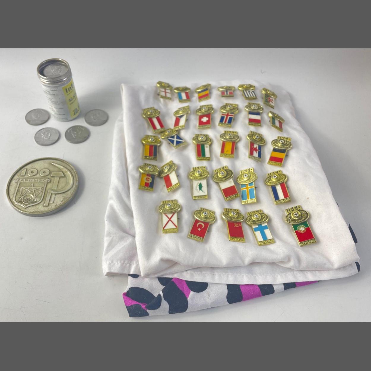 A lot containing a metal tube containing 18 x 1972 Esso FA Cup & 17 x 1970 Mexico England World Cup team tokens / medallions. Lot also inludes 29 Russian / Soviet UEFA 1984 tinnie style badges and another medallion.