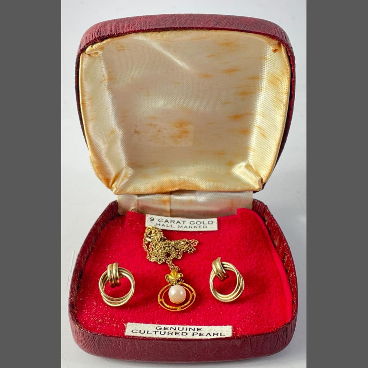 A pair of unmarked yellow metal earrings weight 1.52g approx with a 9ct stamped pendant and chain with a real pearl gross weight 1.76g approx