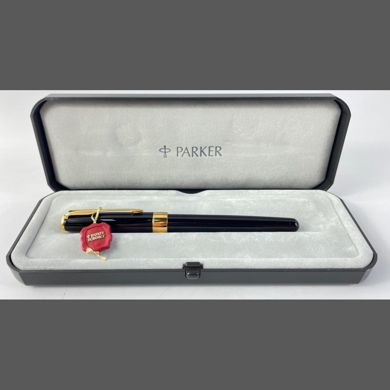 Vintage Mint - Never Inked - PARKER SONNET - Fountain Pen - France - Q11. Boxed as new with tags, outer sleeve, hard shell case and instruction leaflet. Gilt furnishings in mint condition and the beautiful deep black barrel is unblemished. Supplied with unused Parker 18 750k stamped nib