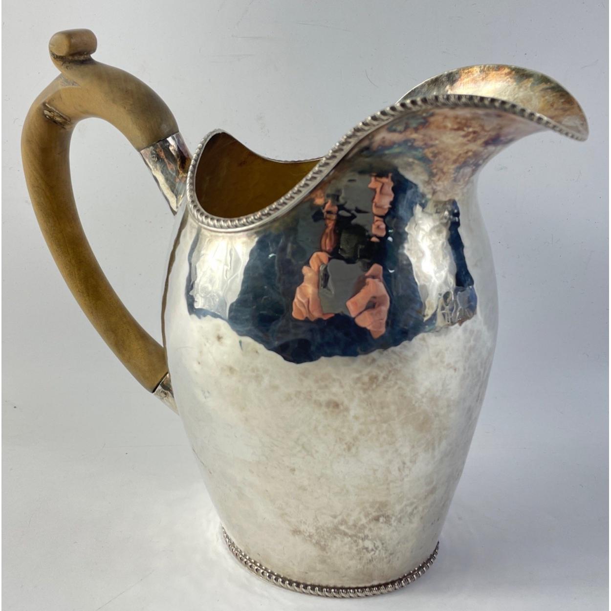 An appealing white metal hammered antique continental wood handled milk jug in lovely uncleaned condition. No makers marks etc. Stands 20cm high. A really rather beautiful piece.