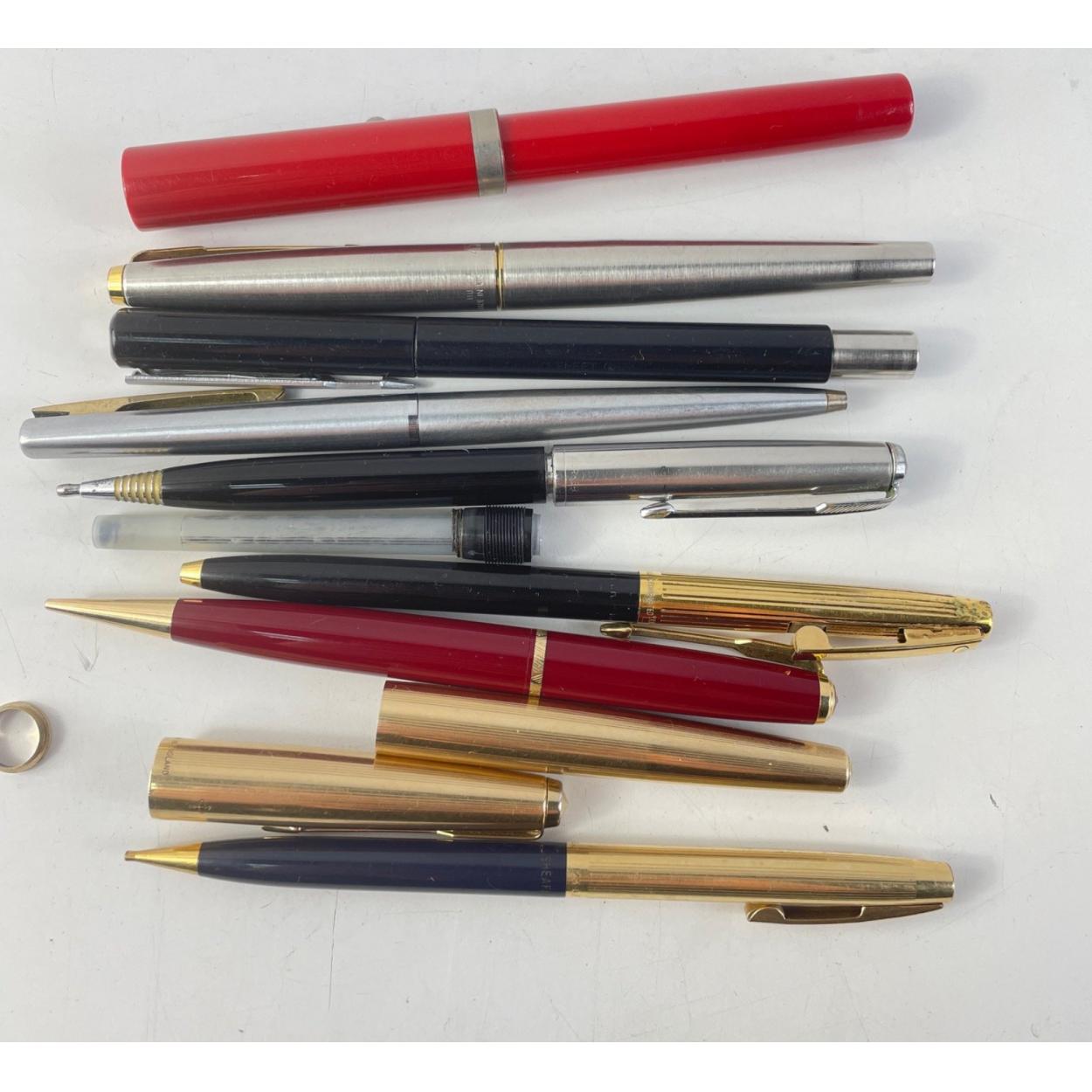 Vintage pen lot to include PARKER gilt metal fountain pen A/F, PARKER Duofold maroon propelling pencil, Shaeffer ball point and others.