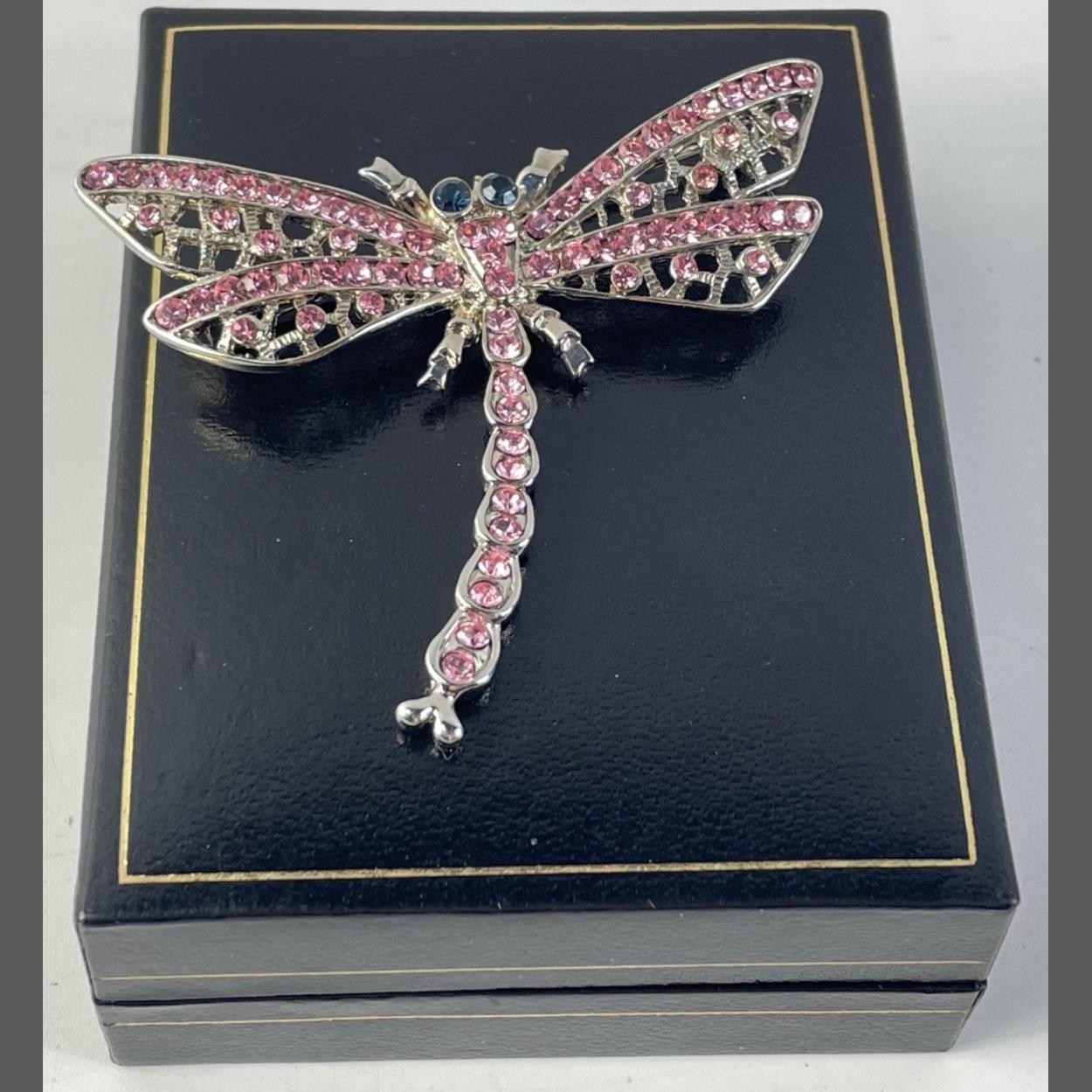 (VNS)A PRETTY bling Dragonfly brooch in white metal with pink stones - dimensions 6cm length x 5cm wing-span approx