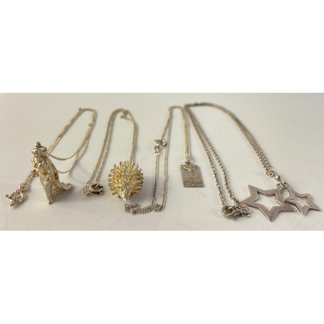 Four rather lovely silver pendants on silver chains, includes a beautiful hedgehog charm and one of a bride. Total gross weight 21g approx