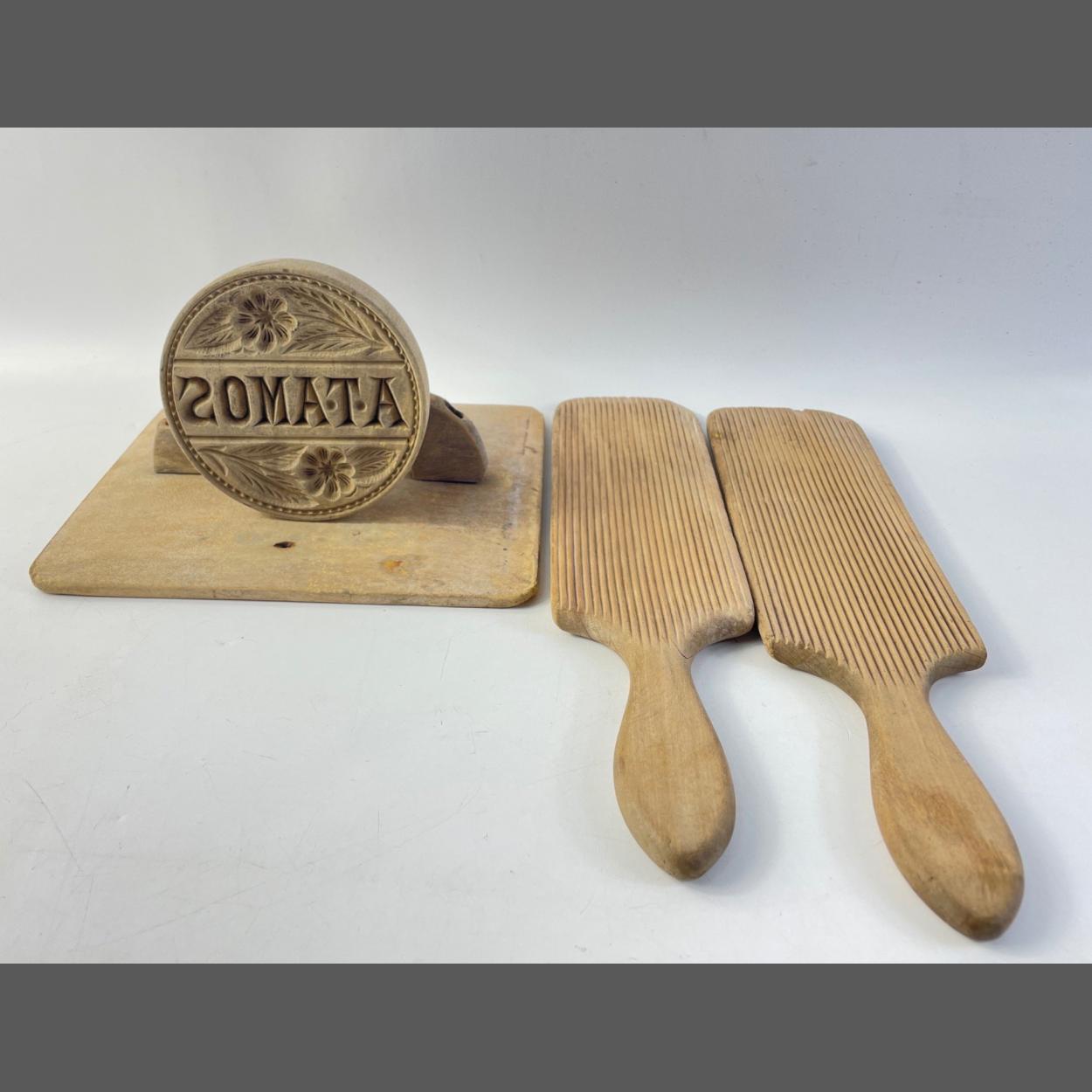 BUTTER MAKING ANTIQUE wooden utensils to include a hand-held butter mould 11cm diameter, a hand-held squarish butter patter 17.5cm x 20cm and two hand-held wooden butter patters/paddles each 31cm long x 8cm wide approx
