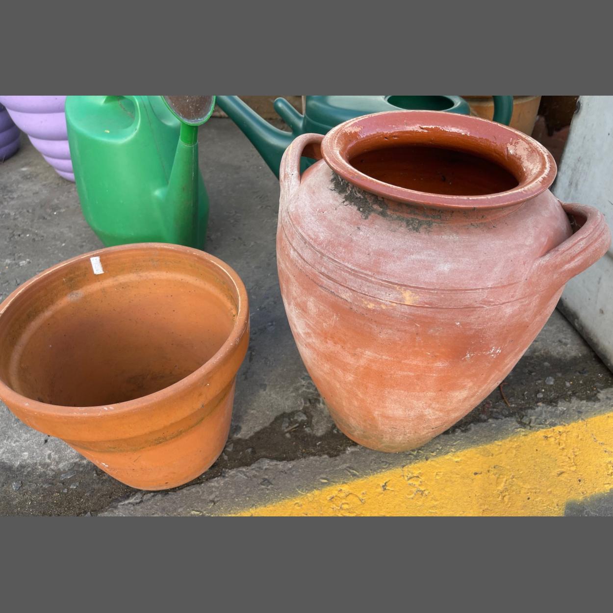 A large TERRACOTTA garden twin handled urn 1ft tall approx and a medium sized terracotta garden pot 24cm high x 22cm diameter
