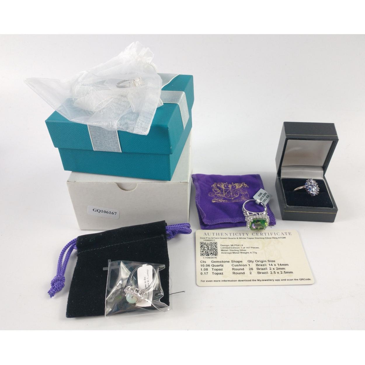 A collection of silver jewellery to include from TJC a ring stamped 925 set with clear stones and central opal size O gross weight 3.4g, a ring set with amethyst coloured stones size P gross weight 3.45g, also from GEMPORIA - a sterling silver ring with green quartz and white topaz setting, size P/Q, gross weight 7.0g comes with certificate of authenticity; and a ring stamped 925 with CZ stone, size P, gross weight 2.5g and a pair of earrings stamped 925, weight 1.15g