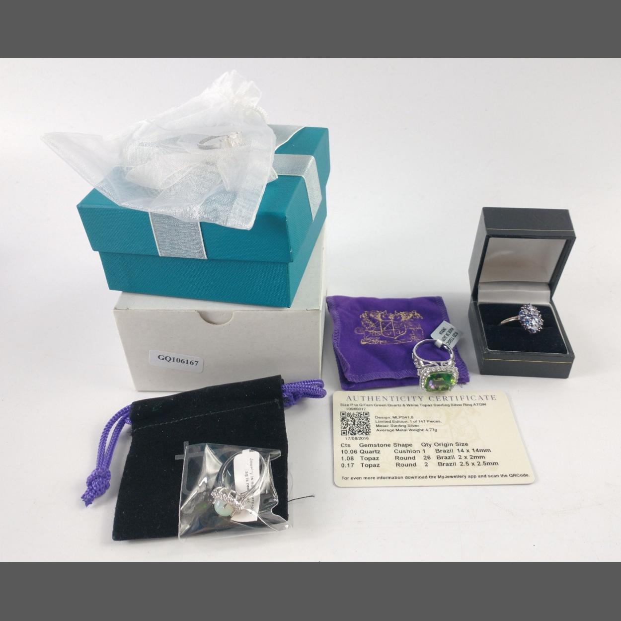 A collection of silver jewellery to include from TJC a ring stamped 925 set with clear stones and central opal size O gross weight 3.4g, a ring set with amethyst coloured stones size P gross weight 3.45g, also from GEMPORIA - a sterling silver ring with green quartz and white topaz setting, size P/Q, gross weight 7.0g comes with certificate of authenticity; and a ring stamped 925 with CZ stone, size P, gross weight 2.5g and a pair of earrings stamped 925, weight 1.15g