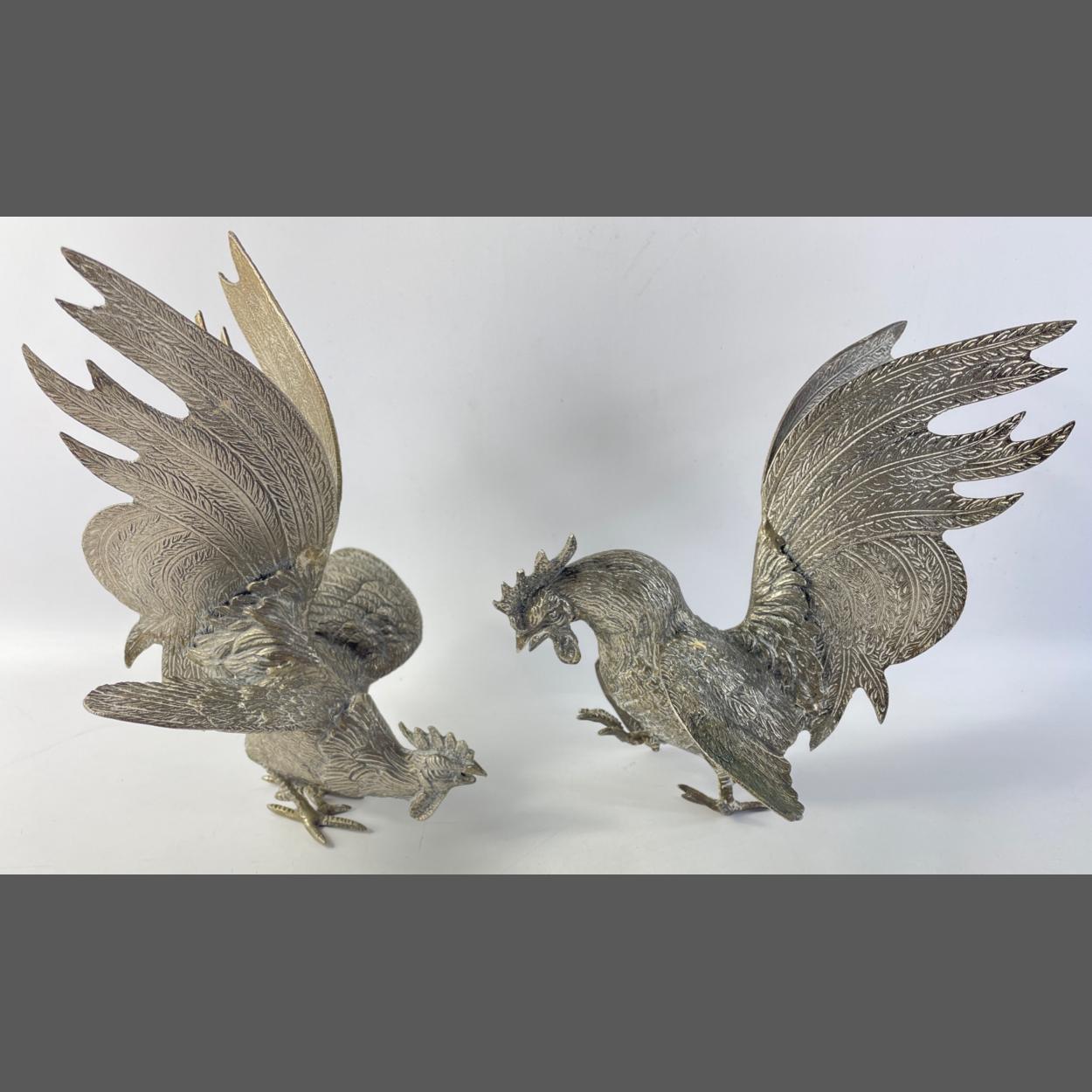 A rather attractive pair of well modelled metal fighting cocks. Tallest standing approx21cm tall. Some residue from older cleaning but generally in good condition.