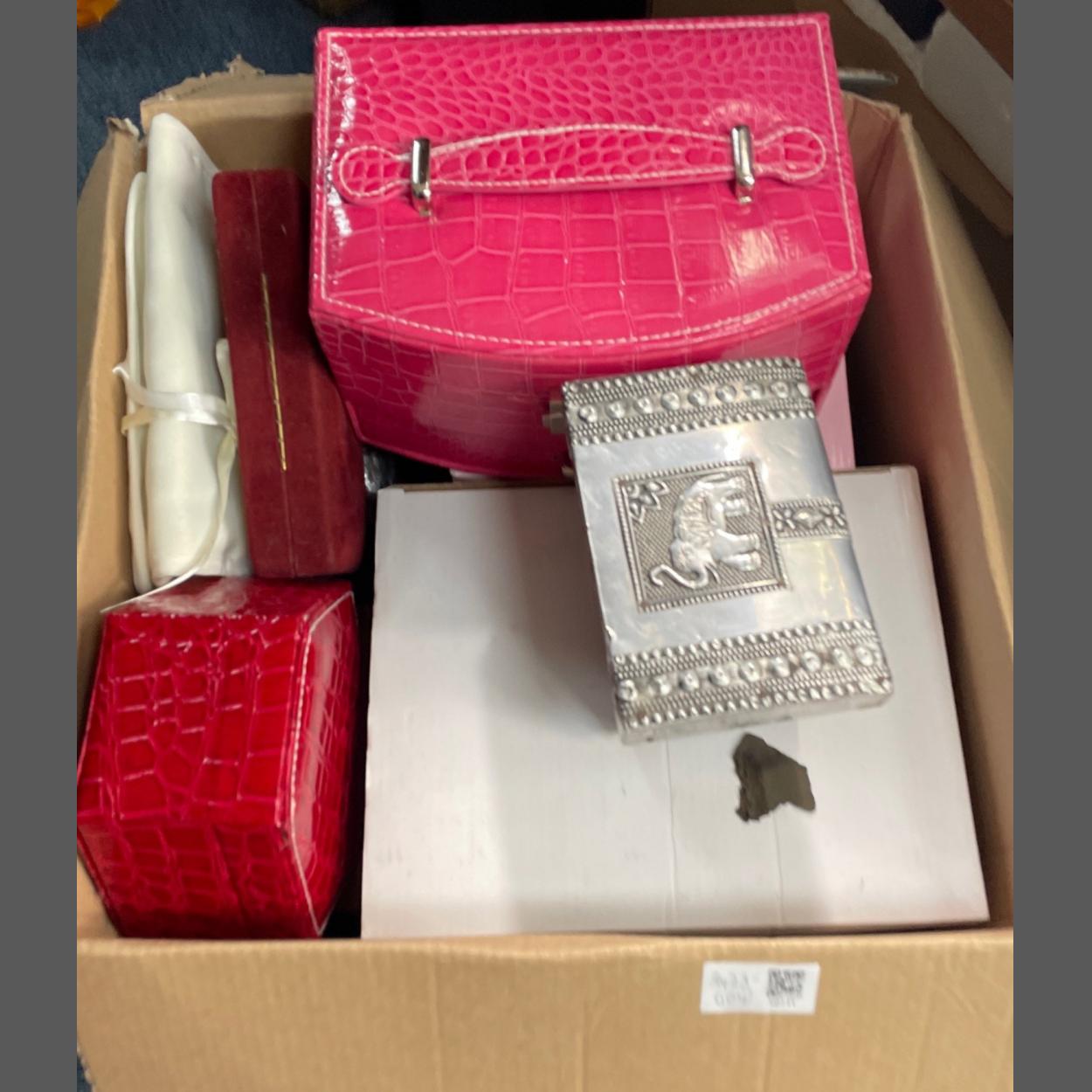 A box full of jewellery boxes to include wooden and leather and of many different sizes and styles