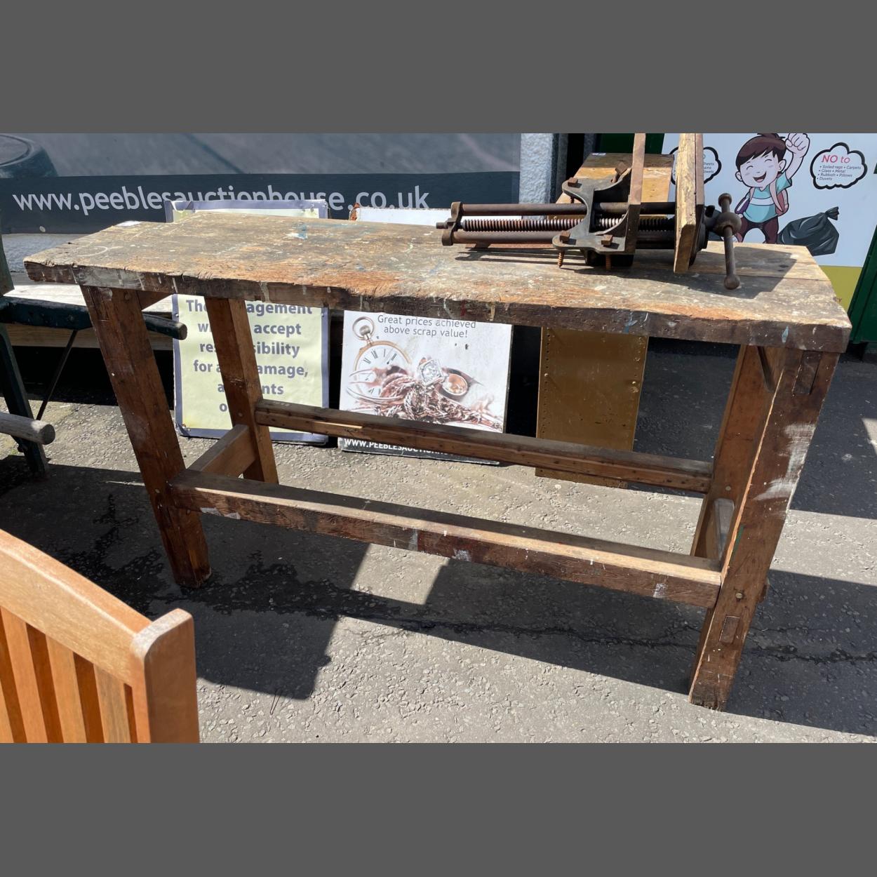 A wonderful old wooden workbench. Has lived a life but continues to be a very useful bench. Measures 155 x 46 x 88 cm approx