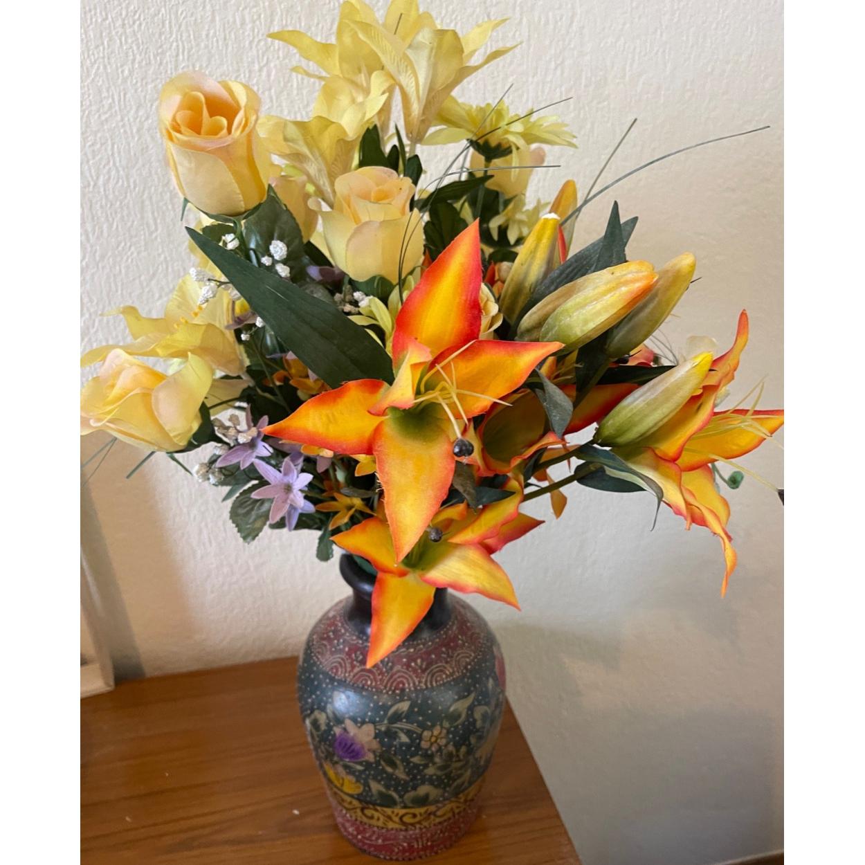 TOP QUALITY SILK FLOWERS ARRANGEMENT in a nice decorative vase - just fit for that lounge window with your net curtains!