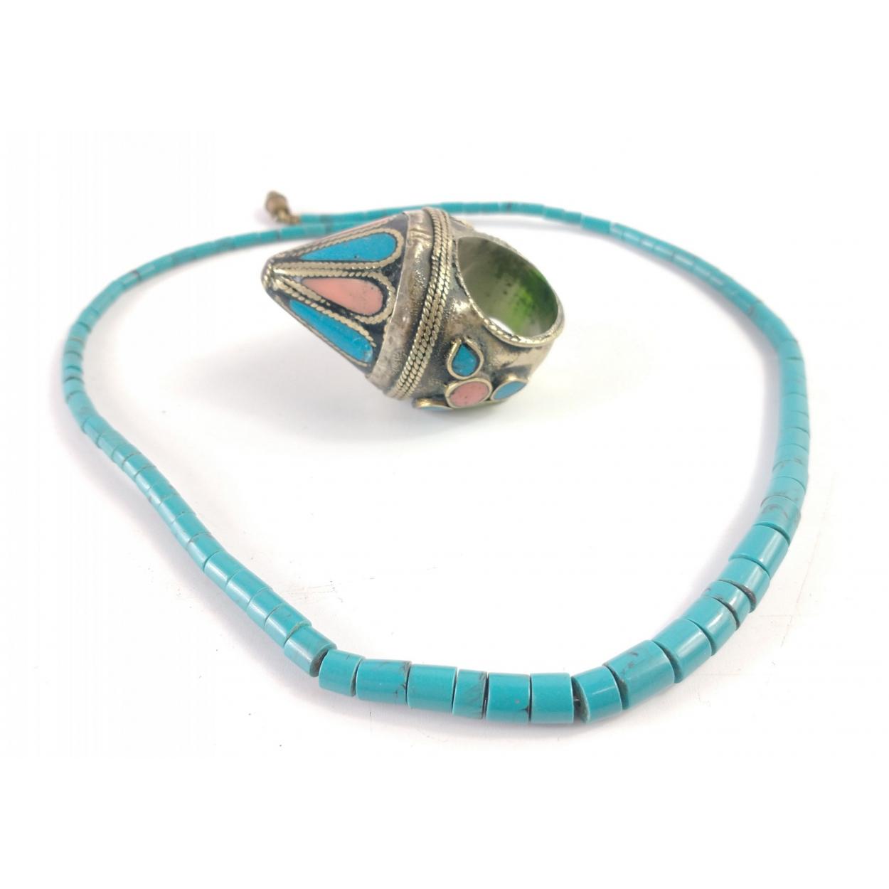 A FLASH large MIDDLE EASTERN pointed white metal ring with local coloured pink and turquoise stones and with also a turquoise necklace