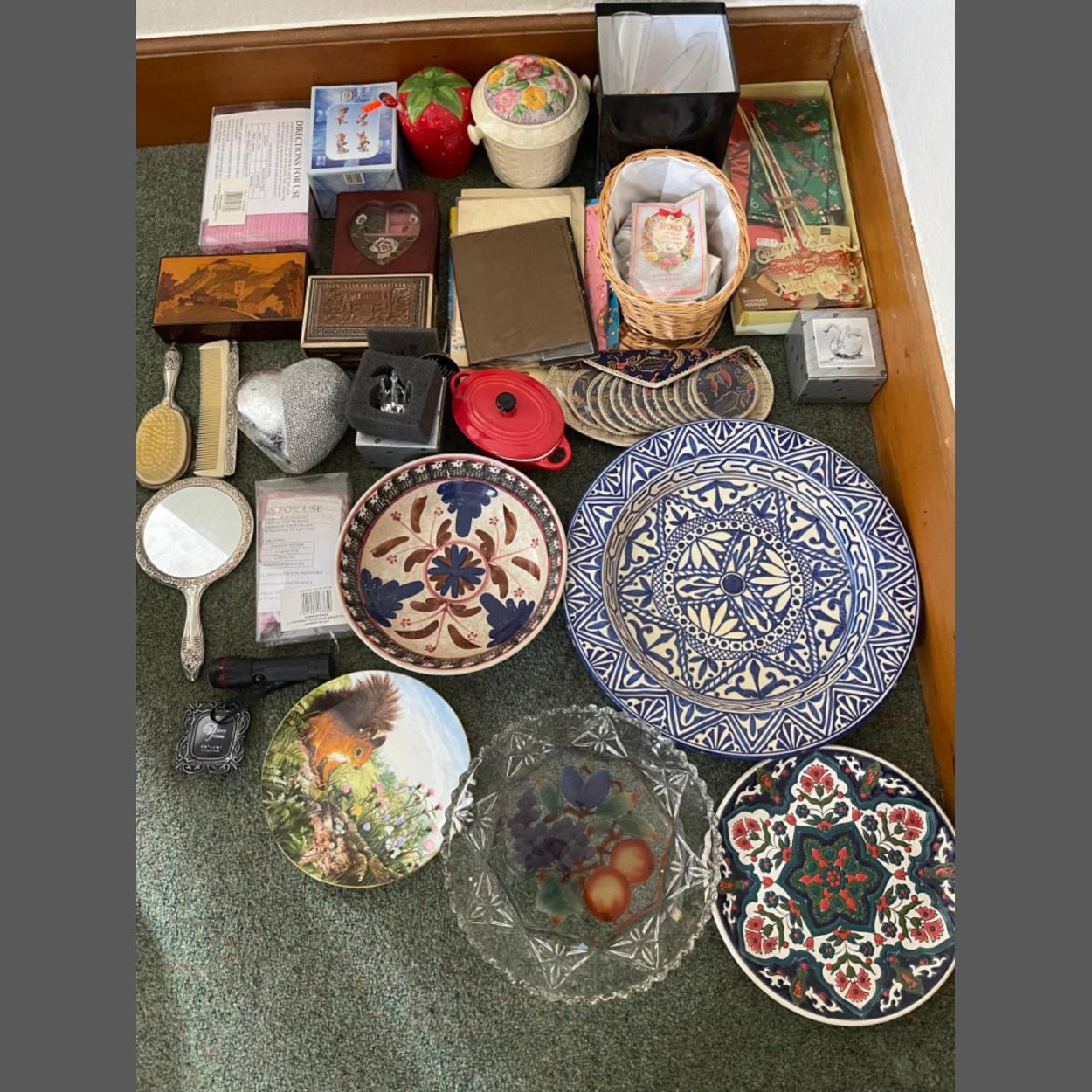 A large mixed boxed lot to include some decorative large plates - beautiful wooden carved and inlaid jewellery boxes and an unusual VINTAGE floral lidded biscuit barrel - a petite Le Creuset inspired red lidded casserole dish etc - and so much more - mostly new unused items!