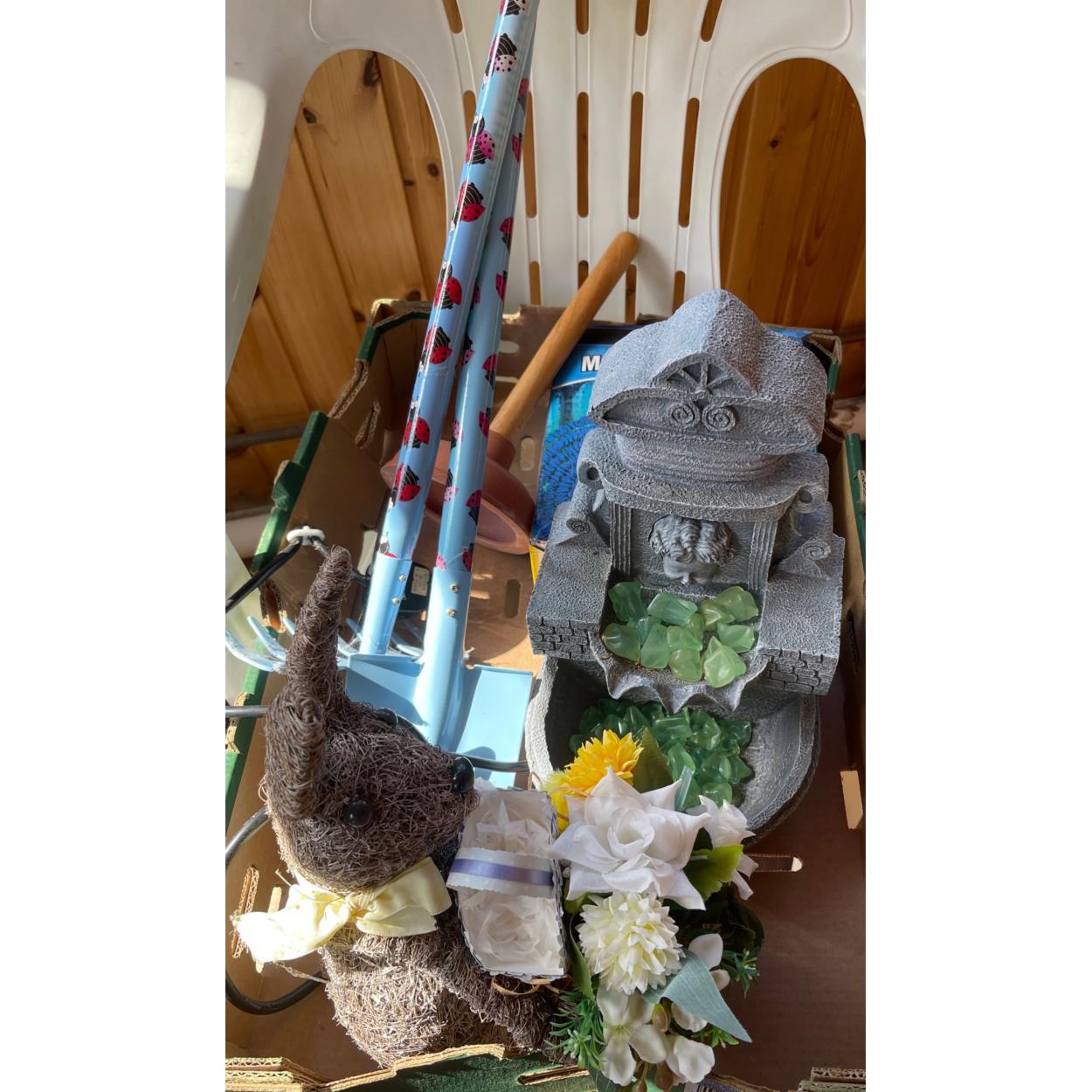 A mixed garden lot to include a kiddies set of garden fork and spade, synthetic planter arrangements, a plunger and a garden model temple with green rocks and much more!