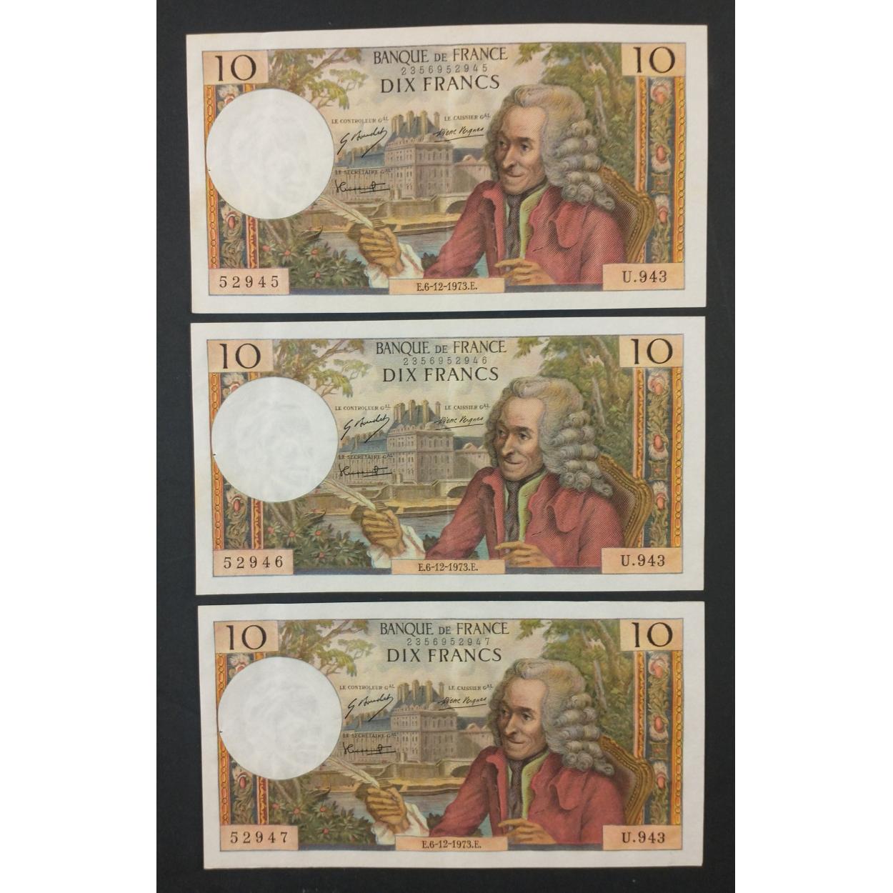 FRANCE Banknote interest. A nice trio of sequential early 1970's Banque de France DIX FRANCS 'VOLTAIRE' banknotes in collectible grade. Notes each have a pinhole, a centre fold, minor creasing and minor staining near edge under close inspection . Still beautiful examples of the art.