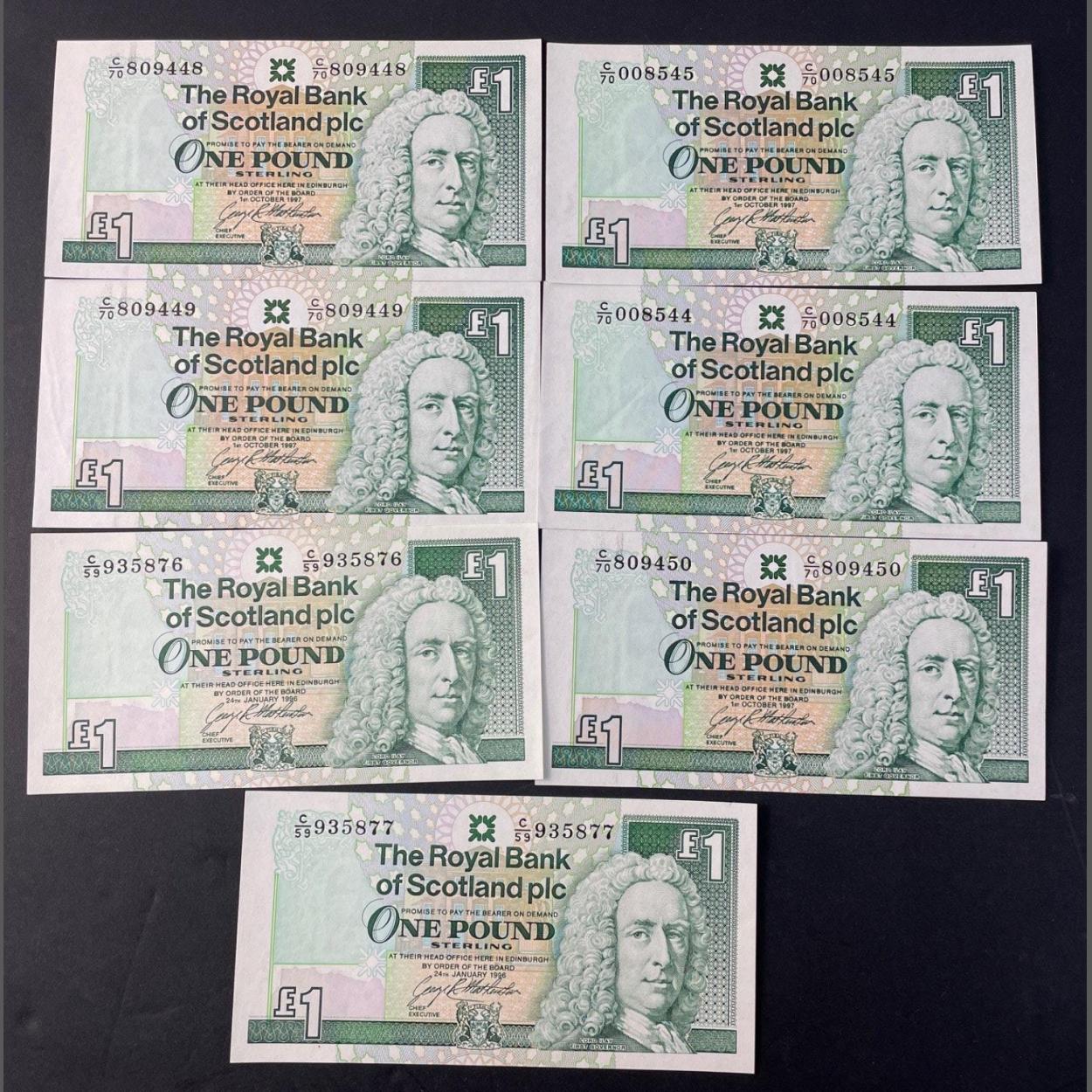 A group of seven mixed 1996 ROYAL BANK OF SCOTLAND One Pound banknotes. Includes a sequential run of three and two further pairs. Lovely crisp notes.