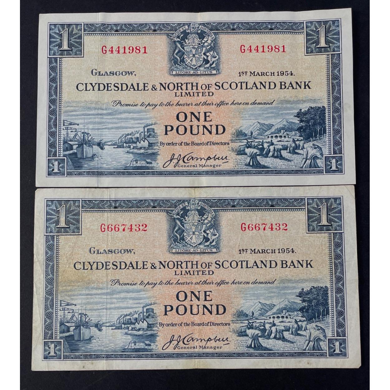 Two CLYDESDALE AND NORTH OF SCOTLAND BANK 1954 One Pound £1 banknotes in good grade.