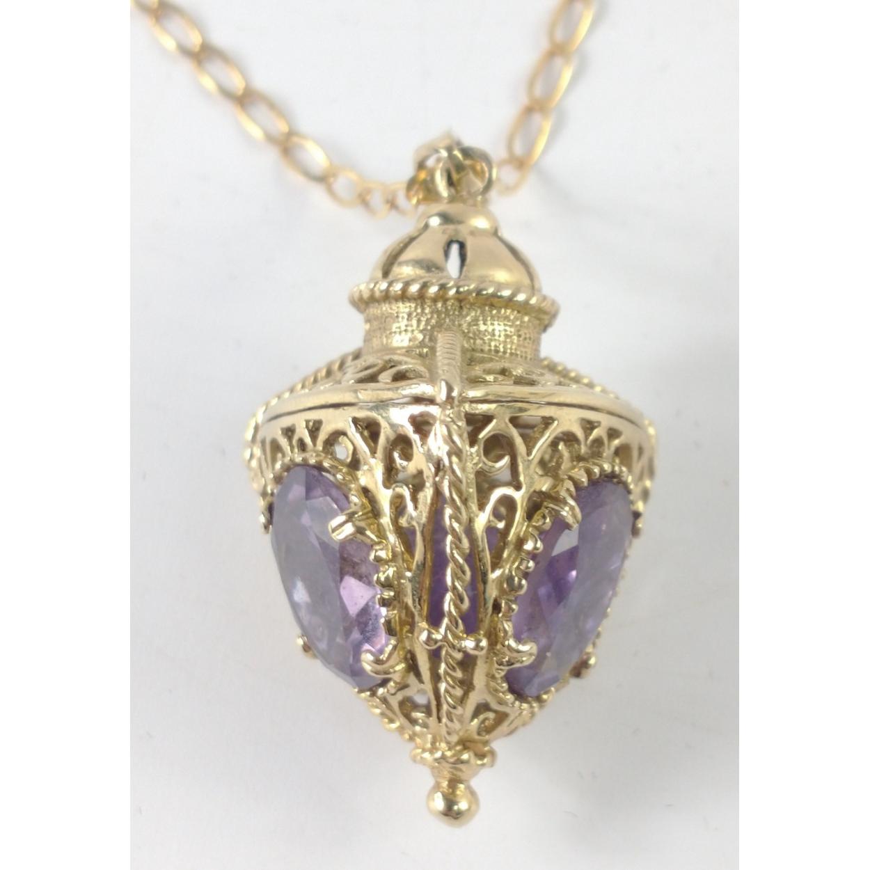 A pomander style pendant and chain, both stamped 375, the pendant holds 3 large amethyst style stones (1cm approx) , the chain measures 46cm approx, gross weight 14.26g approx