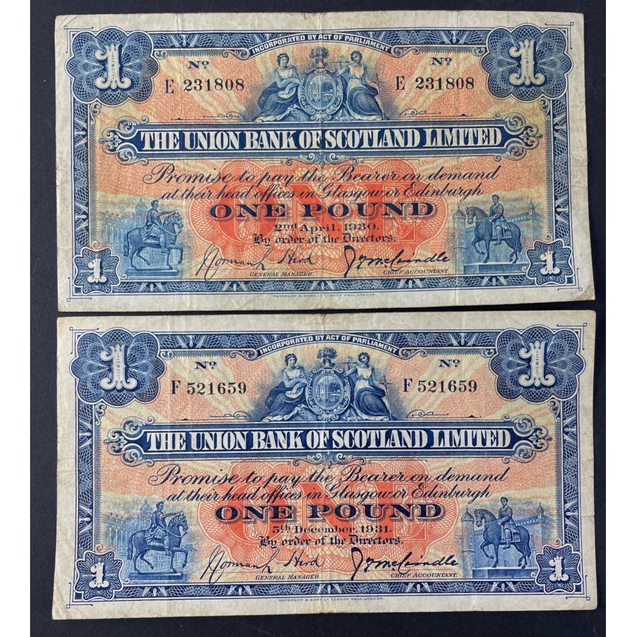 Two UNION BANK OF SCOTLAND 1930 One Pound £1 banknotes with wear but nice collectible notes