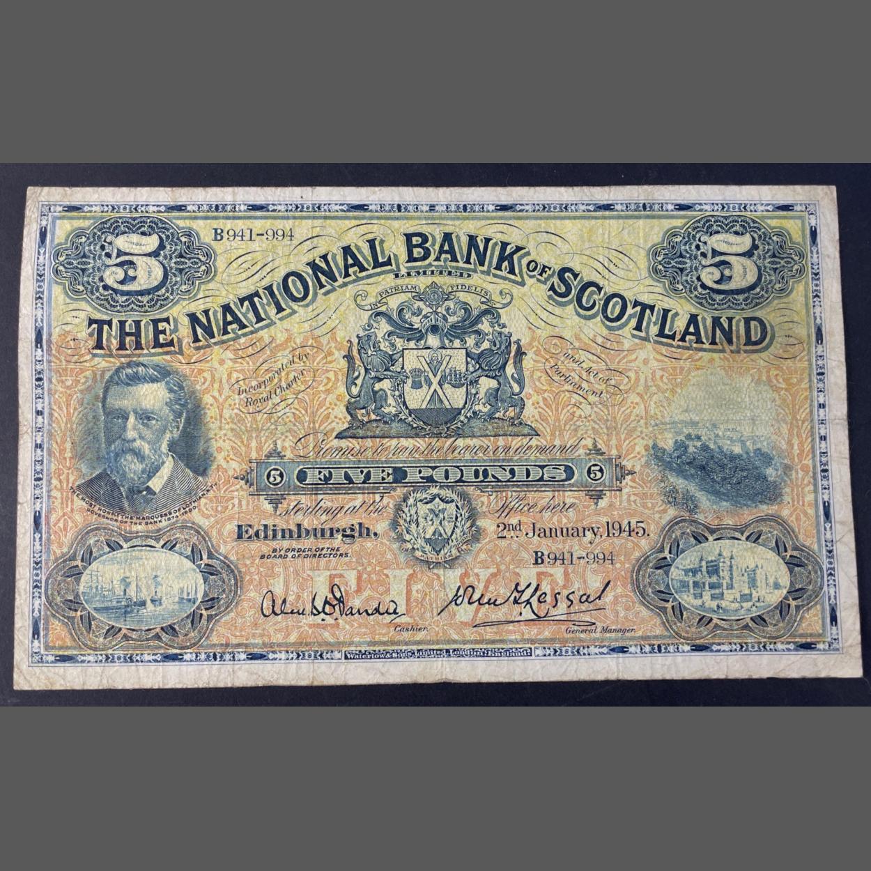 NATIONAL BANK OF SCOTLAND Five Pounds £5 1945. An attractive and collectible note with expected wear.