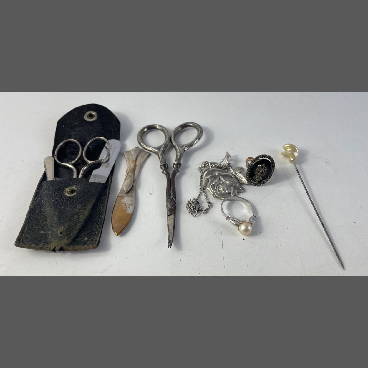 A small mixed lot to include a pair of silver hallmarked nail scissors, Birmingham 1912, weight 14.2g approx, plus a further manicure set, rings, hatpin etc