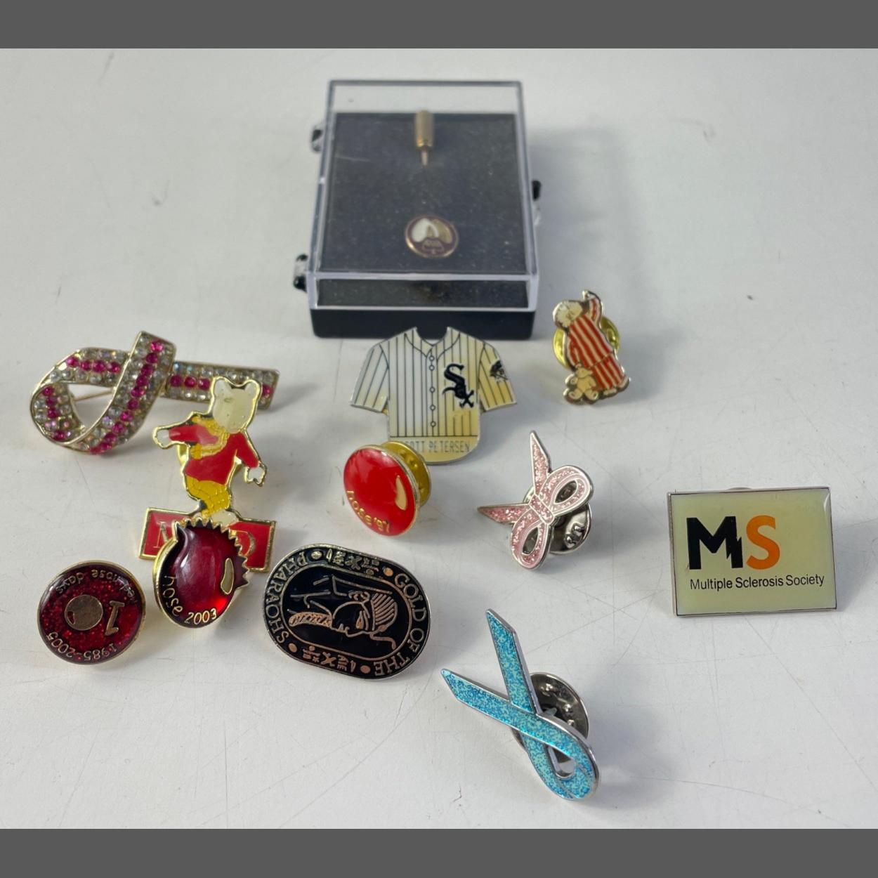 A collection of pins including Red Nose Day from various years and also breast awareness