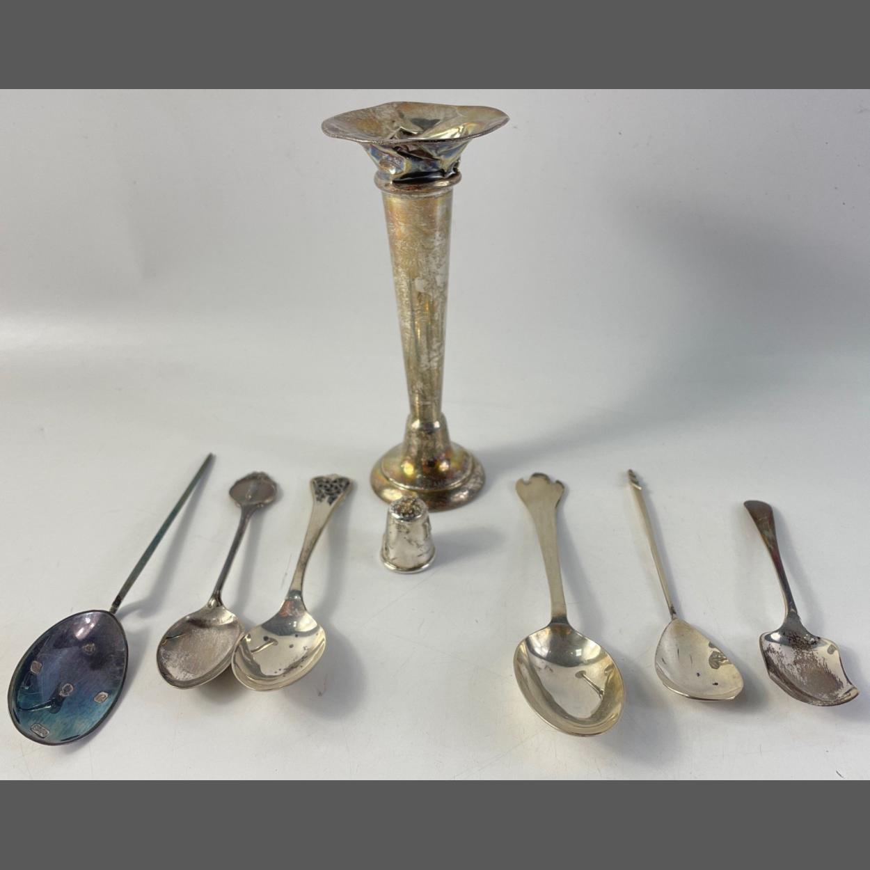 A collection of various silver hallmarked spoons, weight 103g, a silver thimble with a cat design and initial 'M' weight 10g approx, and an inscribed silver posy vase with faded hallmark and weighted base, gross weight 132g (top has been dented)