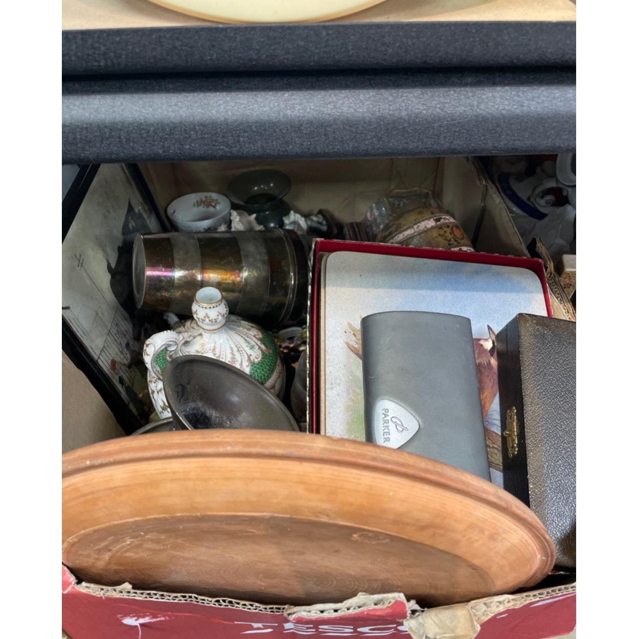 A mixed box of knick-knacks including a hand-painted glass vase, a basketweave dish, an Indian elephant money box, a Lowry print, a LIONEL train watch, and much, much more
