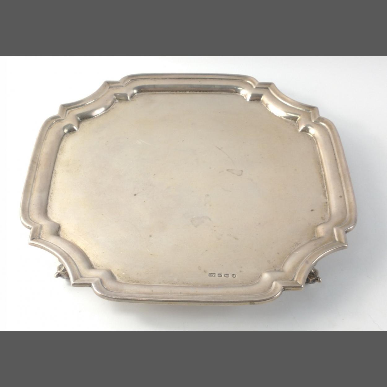 A vintage silver tray supported on bun feet, hallmarked Sheffield 1937, made by silversmiths VINER'S, 27x27cm approx, weight 624g approx