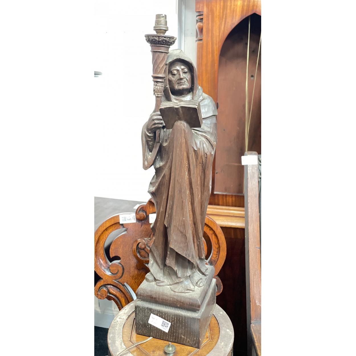 A vintage wooden table lamp in the form of a monk reading a book and holding a torch, (the torch has been damage repaired) stands 54cm tall