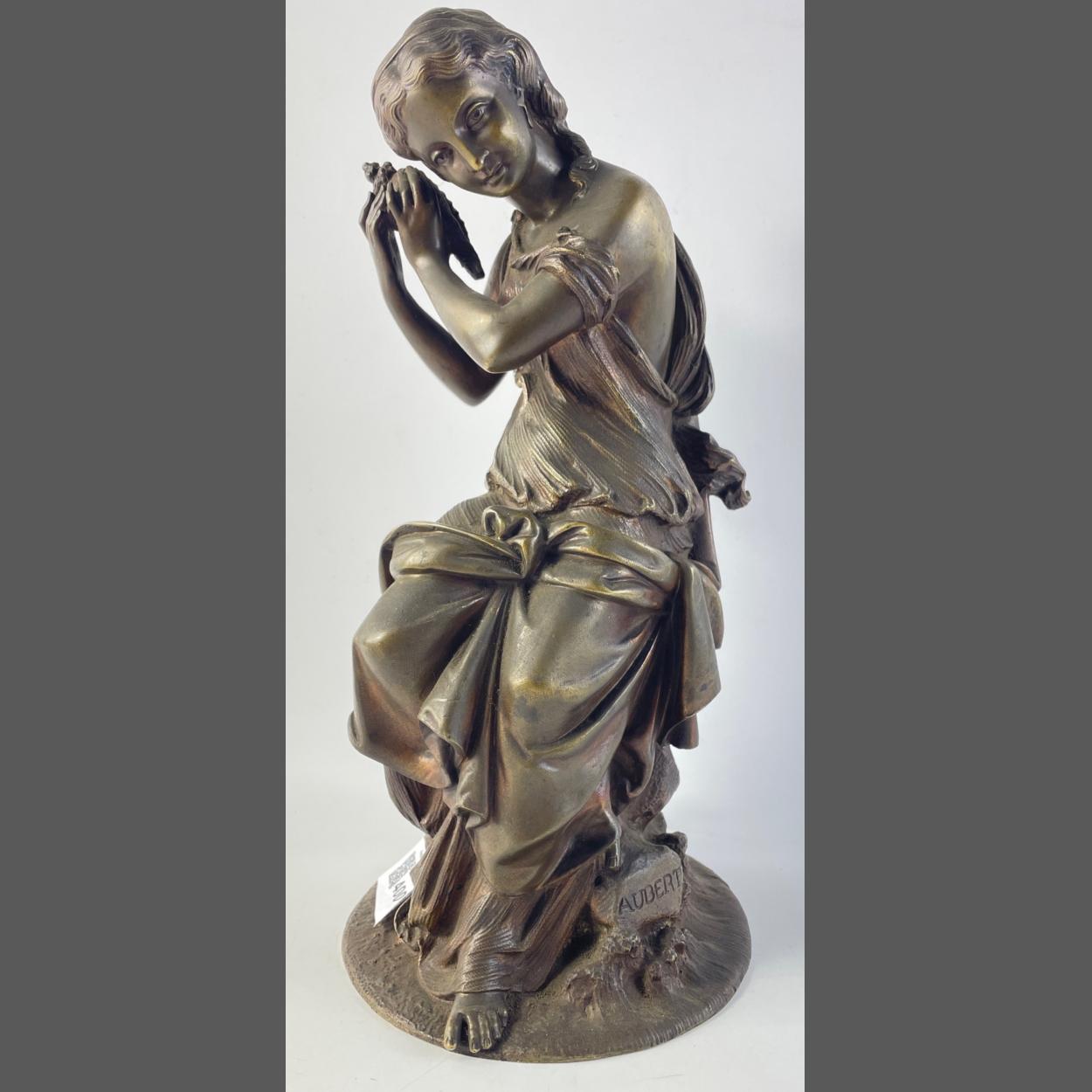 A 19th century open cast bronze figurine signed by AUBERT of a classical lady listening to a sea shell, stands approx 26cm tall