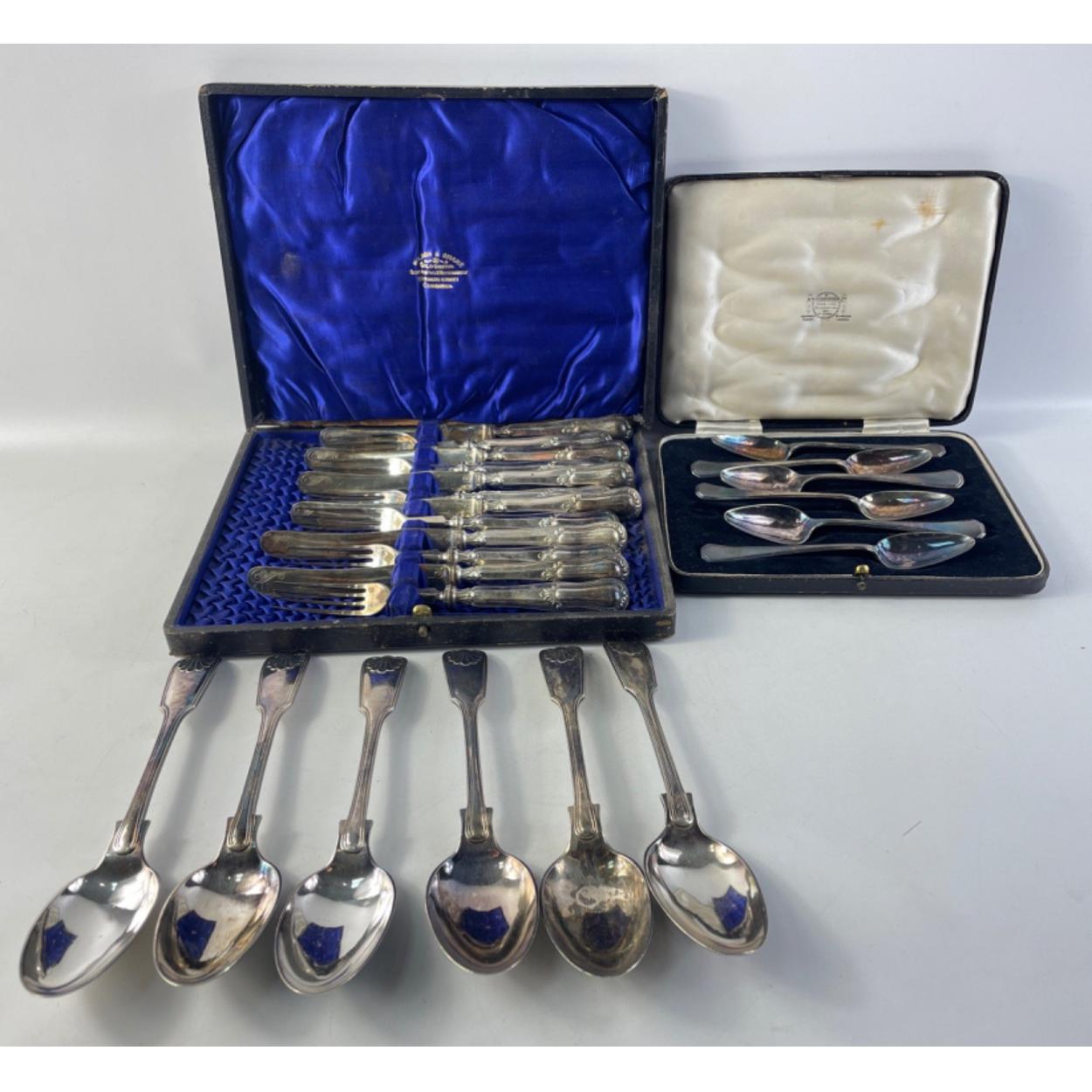 Silver plated cutlery to include a set of 6 dessert spoons, a boxed set of 6 dessert knives and forks, and a boxed set of 6 teaspoons