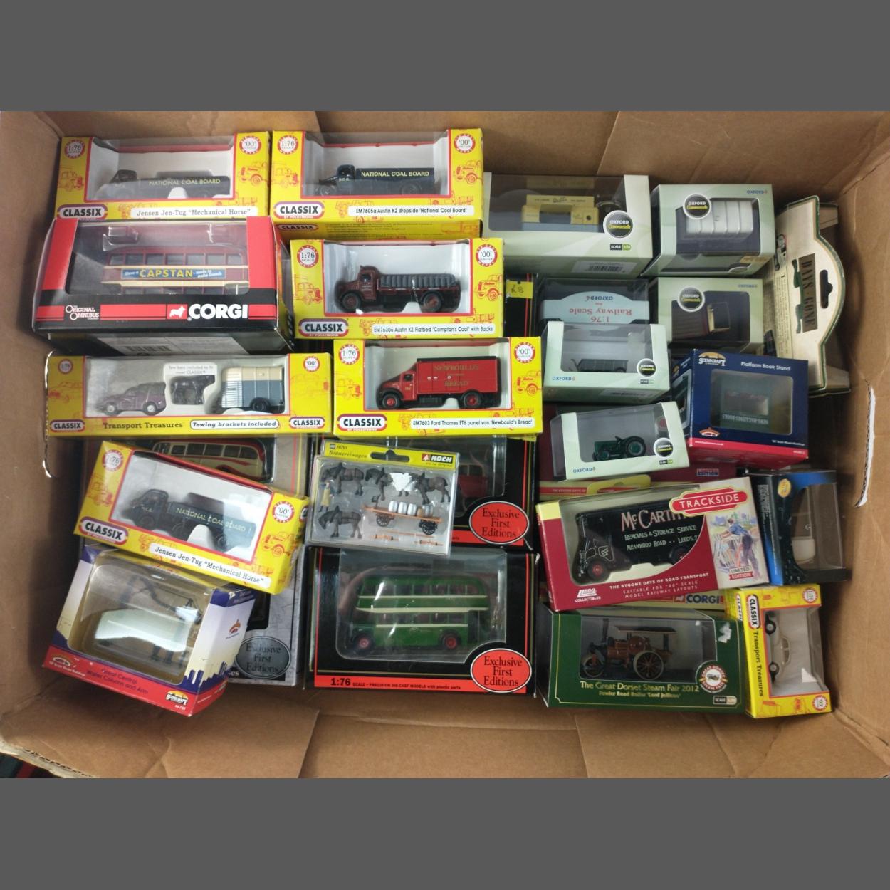 A box of diecast models to complement model railway layouts. EFE, CORGI, OXFORD, TRACKSIDE, CLASSIX and others. A very useful quantity in good condition.