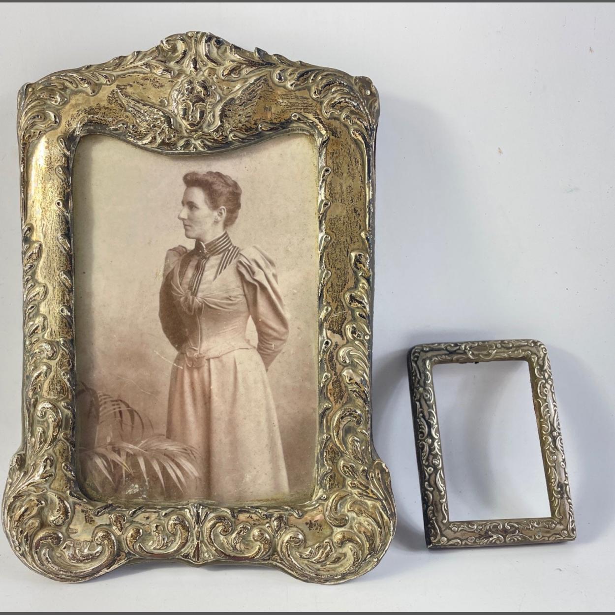 A silver framed photo frame hallmarked Chester 1901, 18x12cm approx, gross weight 249g approx, plus a wooden photo frame 8x6cm (no back) with hallmarked front Birmingham 1899, gross weight 13g approx
