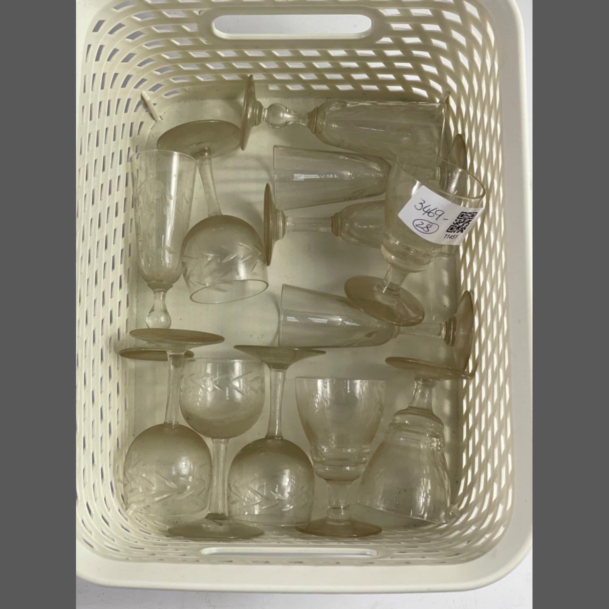 A collection of antique liqueur and small wine glasses including pairs, trios and a four