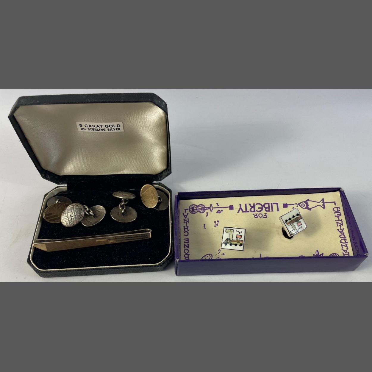 A pair of silver cufflinks with indistinct hallmark (9.35 g approx) plus a tie pin - 9ct gold on silver and a pair of cufflinks by SONIA SPENCER for LIBERTY