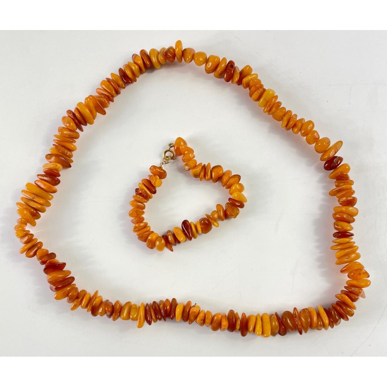 A string of amber beads, approx 56cm long with matching bracelet 20cm long, gross weight 63.7g approx