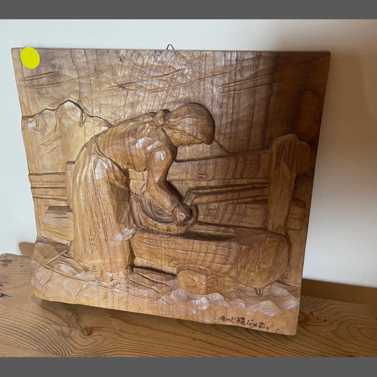 A hand carved wall plaque depicting a young girl in a country scene - signed Art Felix - dimensions 29cm x 27cm