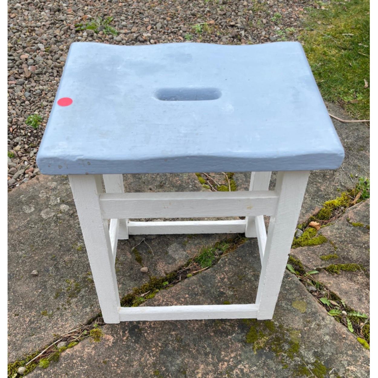STUNNING! An old handcarved wooden stool with white and blue painted decor - 35cm x 30cm top approx