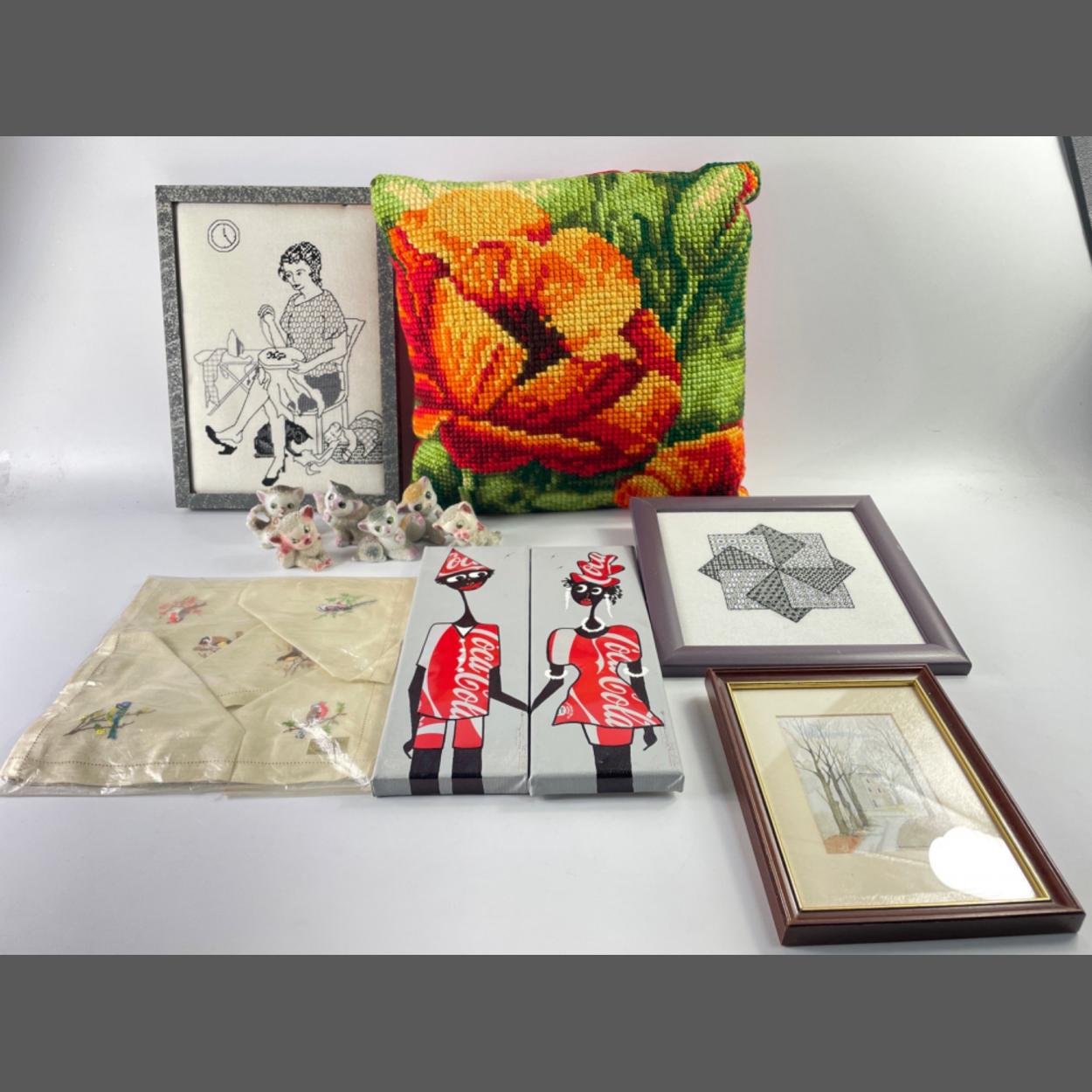 In praise of talented crafters - to include 2 pieces of blackwork one of a woman cross-stitching, 32x23cm, the other a geometric design 24x24cm, 2 interesting works made using parts of coke cans (30x10cm), a set of napkins embroidered with birds, a cheerful cross stitch cushion and a watercolour of Barns Tower by Lyne painted by Gordon Lawson (frame size 20x16cm approx)