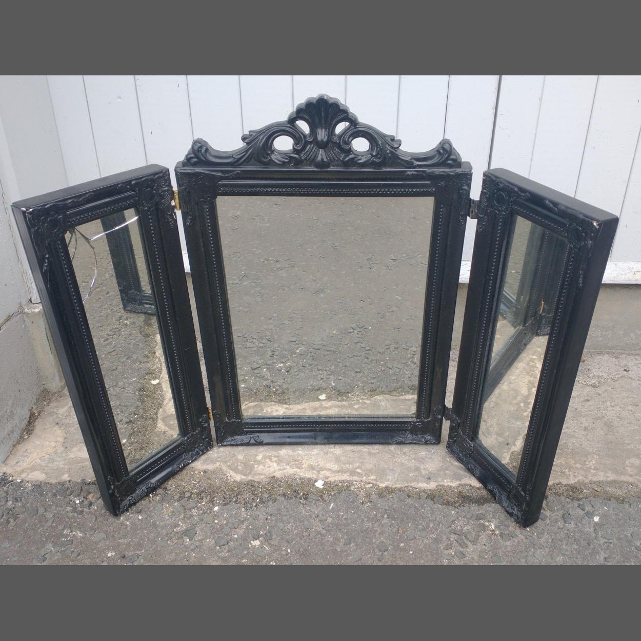 A Gothic style black triptych mirror for a dressing table, largest section measures 55x35cm, glass cracked on one of side frames