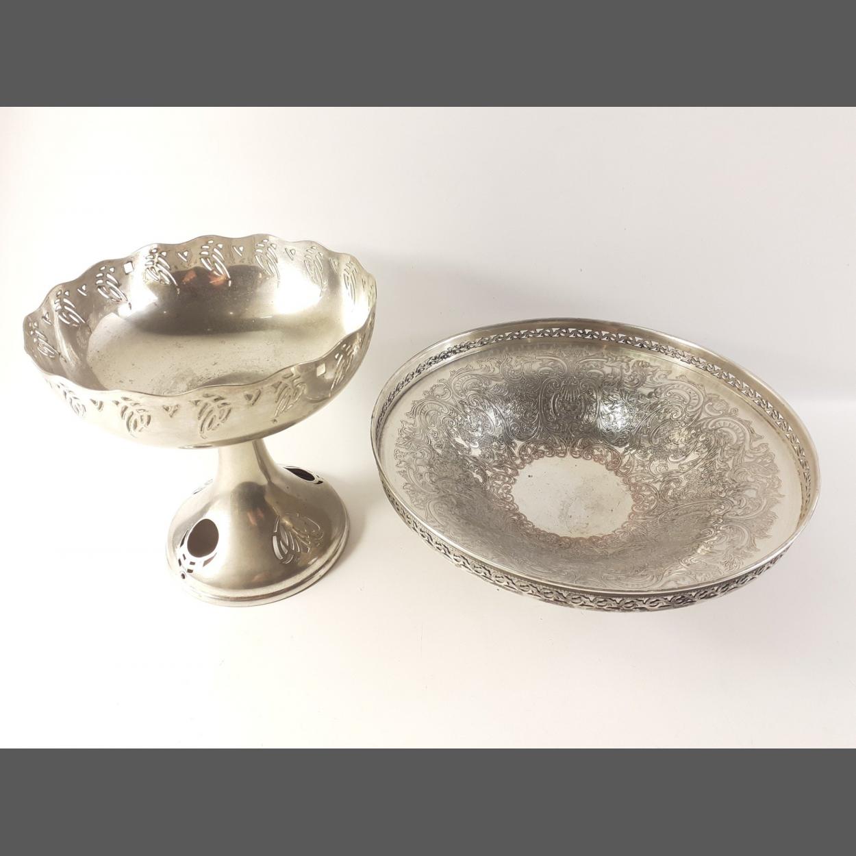 Two silver plated comportes one 19cm high x 20cm diameter, the other with a heavily decorated interior and pierced gallery stands 11cm high with a diameter of 27cm