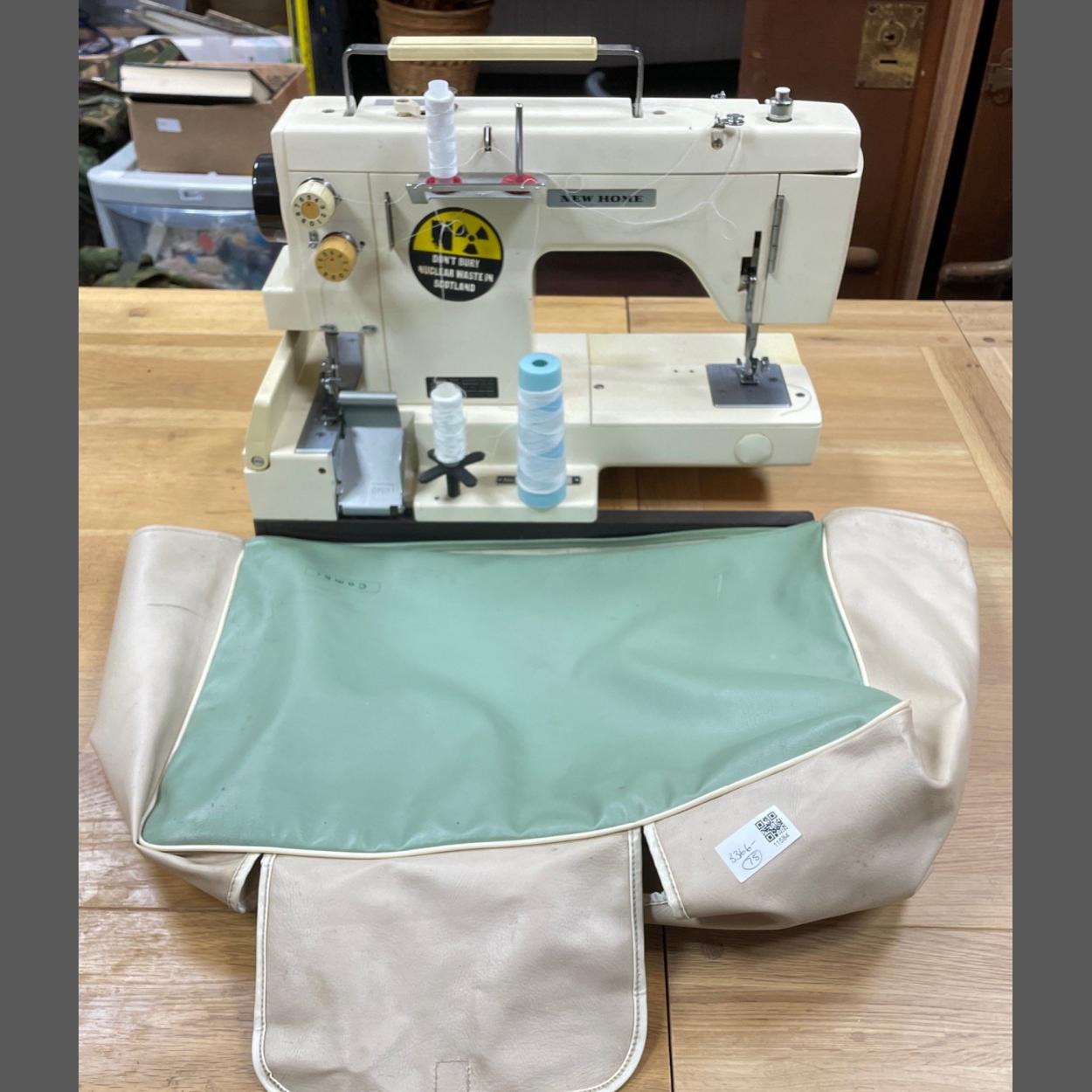 A NEW HOME Combi 10 combined sewing machine and overlocker. Comes with instruction book, cover, foot pedal and power cable plus a box with additional foot attachments, light bulb plus scissors and various haberdashery items