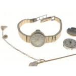 A 375 stamped gold Swiss made LONGINES watch case and an indistinct hallmark stamped bracelet in yellow metal - gross weight 19.75g approx with another LONGINES watch head and 375 stamped back plate (back plate on its own weight 1.38g approx) and an unmarked yellow metal pin with small pearls1.50g approx - an original LONGINES watch case comes with all of this lot!