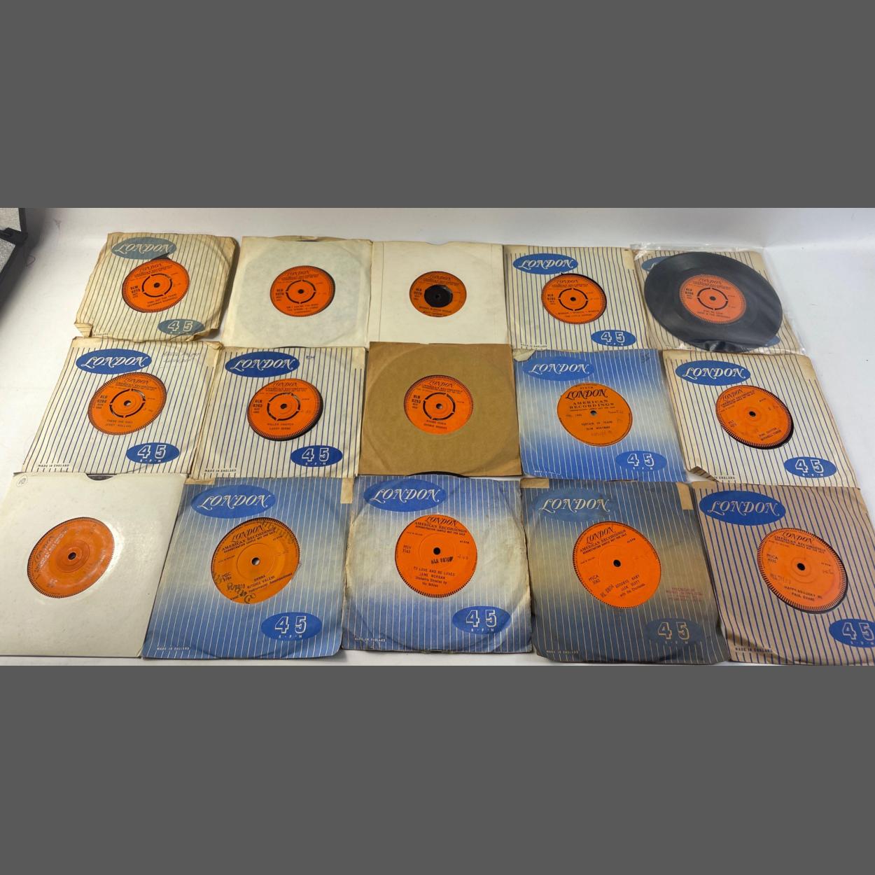 An interestingly valuable selection of 15 LONDON AMERICAN RECORDINGS ORANGE LABEL - Demonstration Sample Not For Sale - 45rpm vinyl records from the 1960s PARTNERED with their respective release disc to include Mitchell Torok, Jack Scott and The Chantones, Ritchie Valens, a rare Savannah Churchill (HLW9273) and many others.