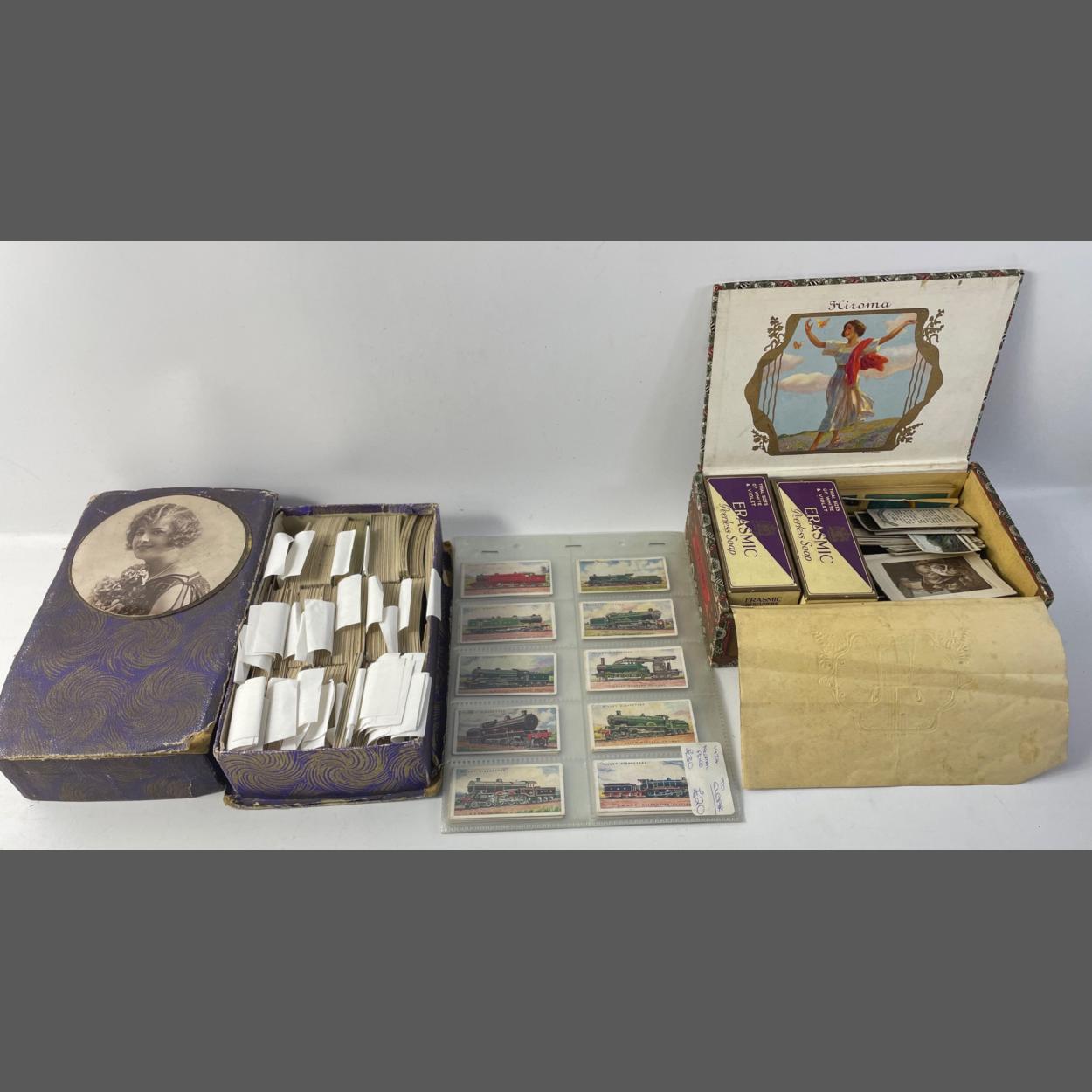 A cigar box containing a collection of cigarette and collector cards of interest.