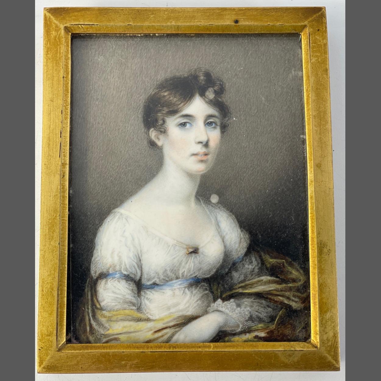 Stunning original miniature oil on wafer of LADY HANNAH ELLICE (1785-1832) the daughter of 1st Earl Grey of tea fame. Presented in a solid brass frame with rear inscription. unsigned but clearly by an accomplished hand 25 x 100mm. A beautiful portrait of a society beauty.