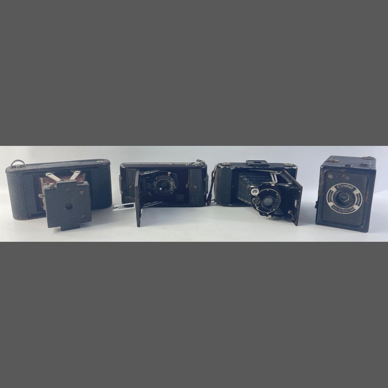 Four vintage cameras. Zeiss Ikon, Soho Cadet, Eastman Kodak, Coronet box camera. All appear to be in well used condition.