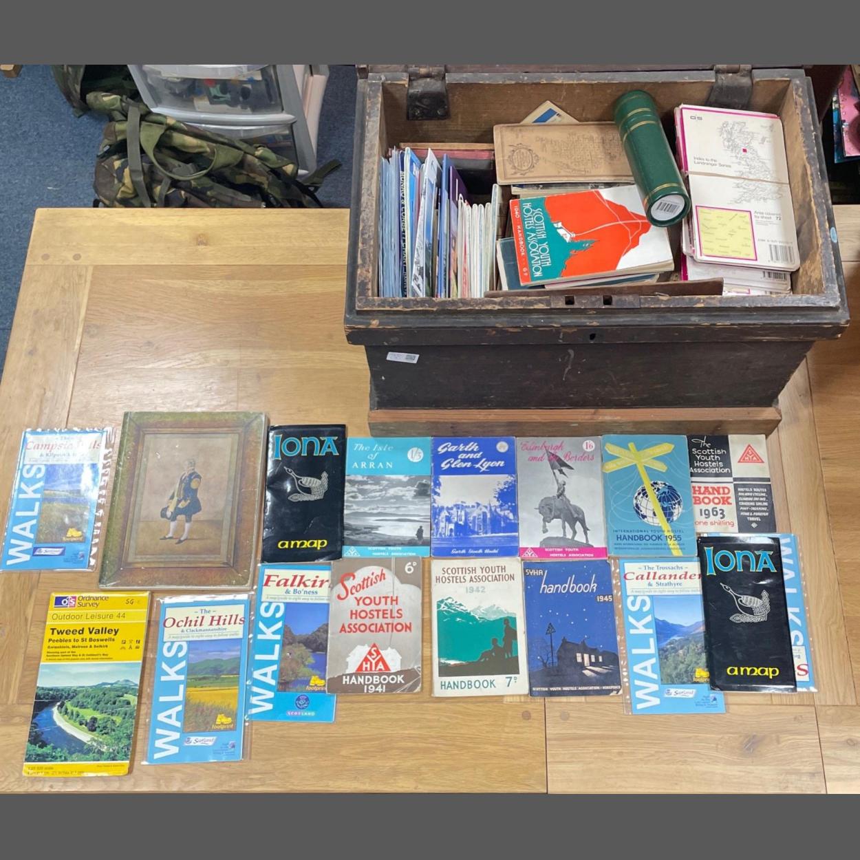 Ready for a voyage of exploration - a wooden twin-handled chest (58x36x33cm approx) plus a bundle of Youth Hostels Association booklets including Scottish Hill Tracks - North and South as well as the SYHA handbook for 1947. Also vintage geography school books including "GEOGRAPHY FOR CHILDREN on a perfectly easy plan adapted for the use of schools and private families" by John Guy published 1874 and a COMPENDIUM OF GEOGRAPHY published 1860