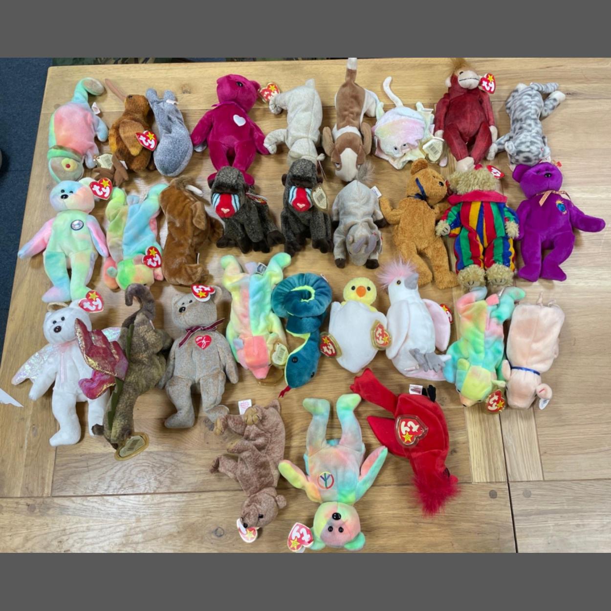 A box of smaller sized TY BABY BEANIES to include 1999 Signature Bear, Eggbert, Cheeks x 2, Pecan, Millennium, Kuku, Slippery, Scorch, Sammy (x2), Silver, Fuzz, Valentina, Halo, Paul, Peace (x2), Knuckles, Beak, Goochy, Goatee, Almond, Hissey, Piccadilly, Mac, Tracker, Rainbow, Schweetheart, BB Bear